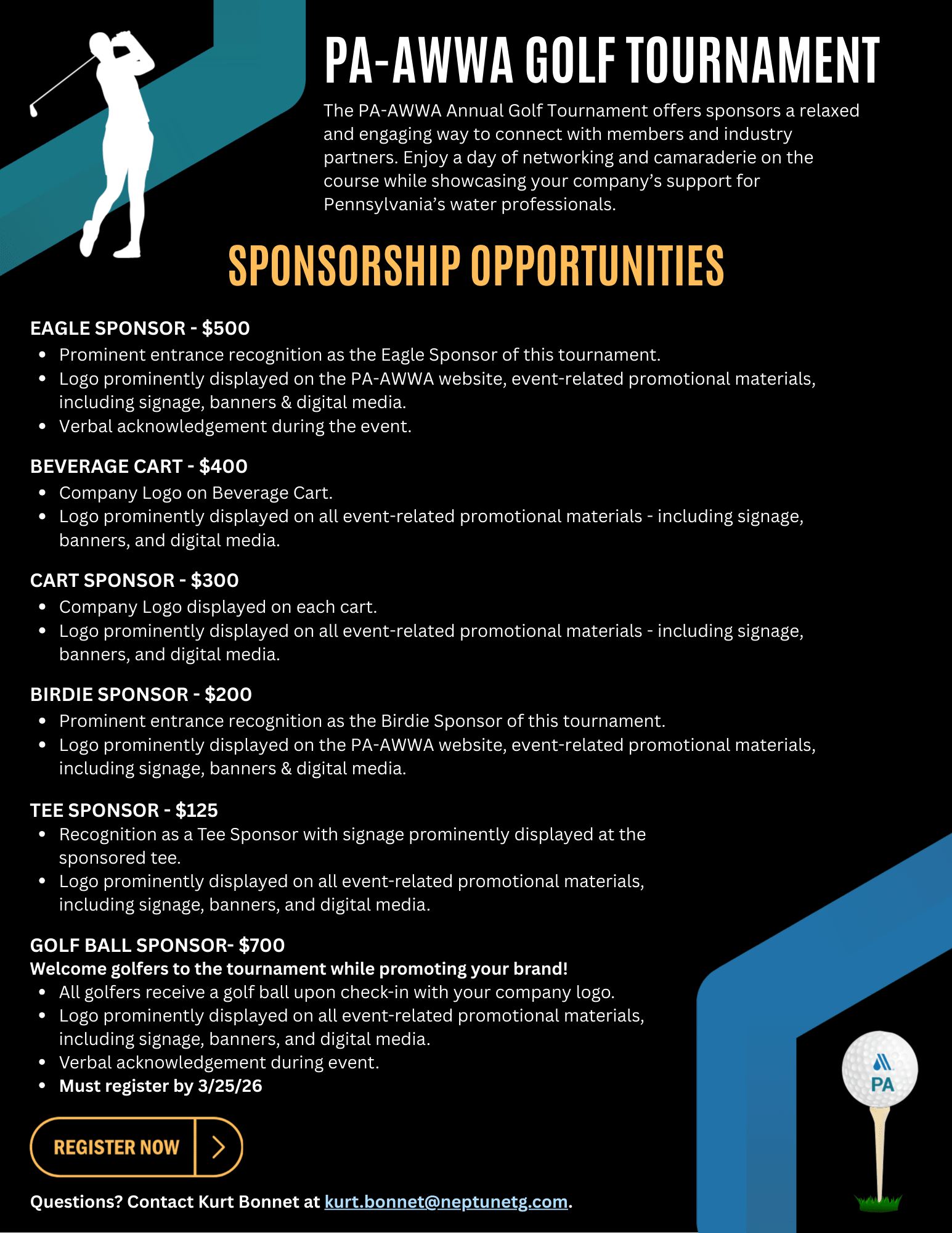 NEW FOR 2026! Sponsors - you can sign up to sponsor the Golf Tournament through this portal, as well as the 78th Annual PA-AWWA Conference & Expo Exhibitor portal for easy access.