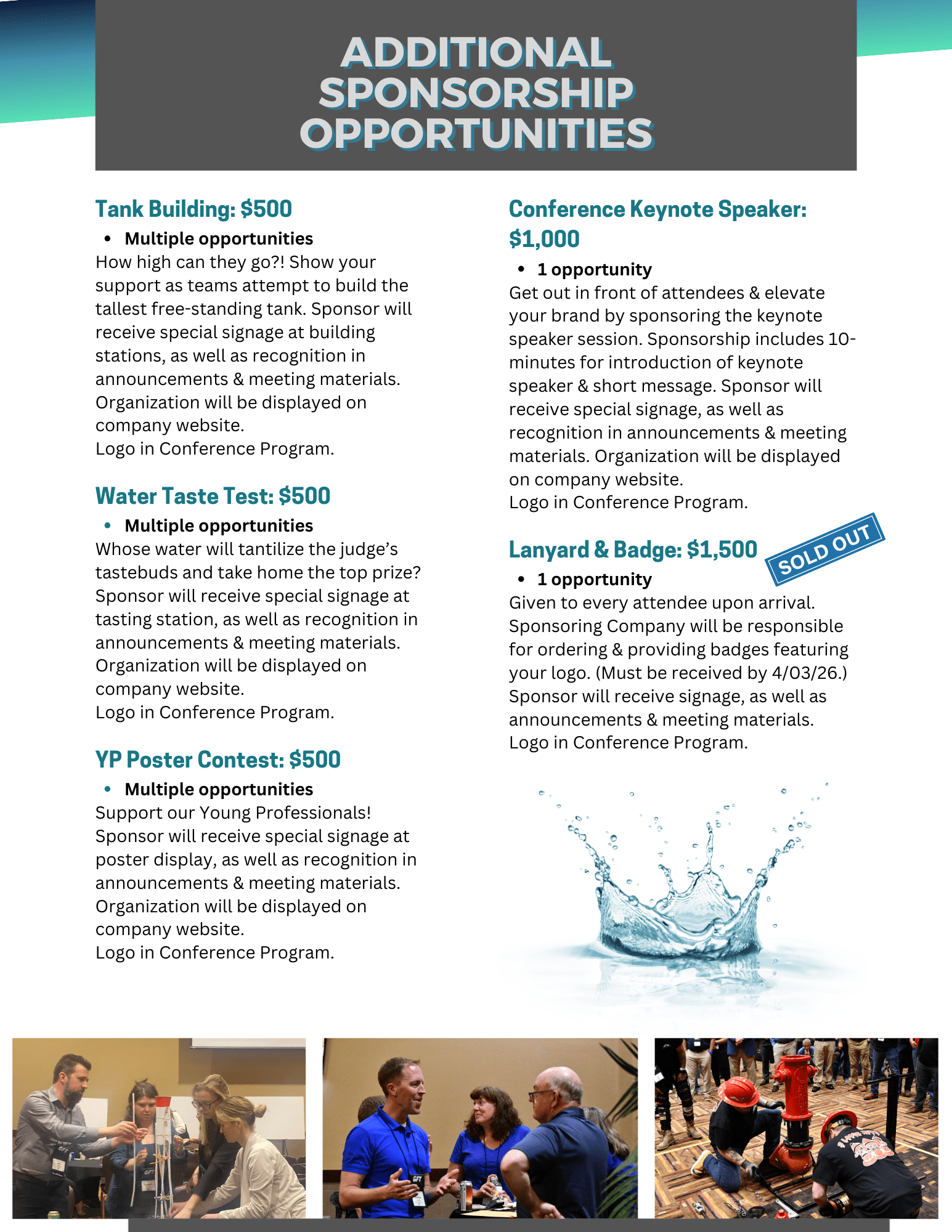 | Lanyard & Badge Sponsor $1,500 | Given to every attendee upon arrival. Sponsoring Company will be responsible for ordering & providing badges featuring your logo. |